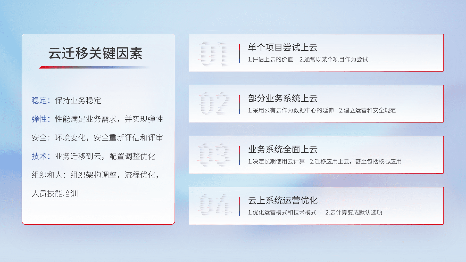 结合实际业务,,,,从规划设计、、云平台选型、、、云原生改造、、、、数据迁移、、集成交付,,,迁移全过程为客户识别最佳上云路径,,,做好风险识别管理,,,设计网络架构、、、、身份权限、、、、安全审计合规、、、、操作审计、、、日志审计、、、、监控告警策略、、、、多站点容灾设计等,,,,对云上基础设施进行整体规划,,提升IT治理水平,,以满足弹性、、、高可用、、、、高性能的需求。。