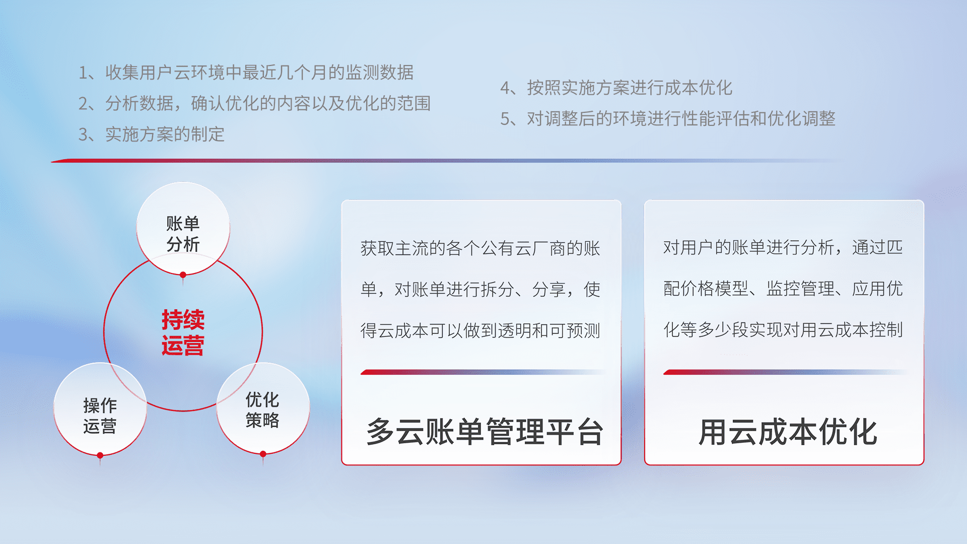 通过多云纳管,,,以统一的资源数据模型把客户的云资源进行抽象和封装,,,进而实现对多云资源的统一操作,,,保障云资源管理的可靠性、、、、稳定性与可用性。。。量身定制化运维内容,,配置、、开发运维、、、补丁管理、、备份、、、、监控、、认证和访问管理、、、审计和日常巡检等,,,,保障在用云过程中的可靠度,,,稳定度以及高可用率。。。。