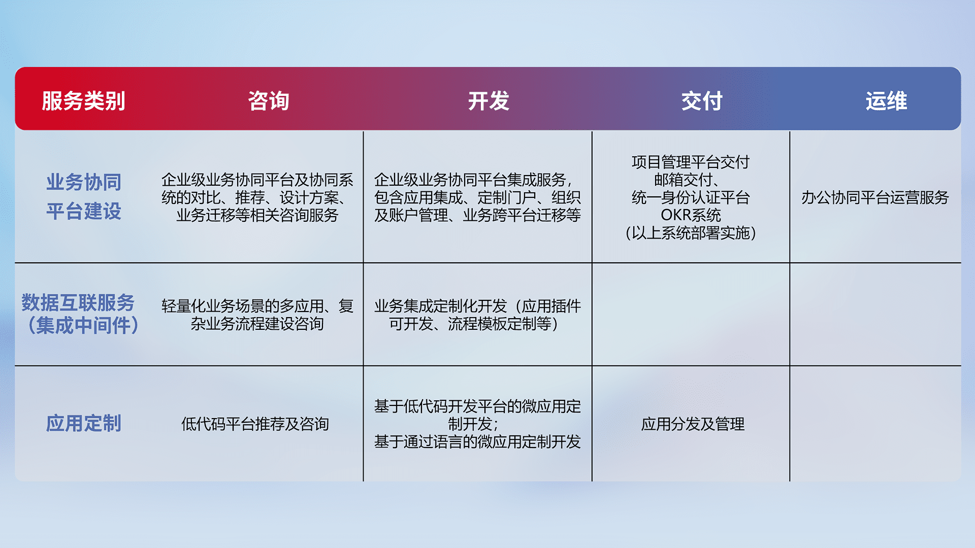 针对钉钉、、、企微、、、IDaas等平台级产品提供产品的规划、、、、方案、、、交付、、、、定制化开发等服务,,,,实现如统一协同办公、、、智能客户服务、、混合会议管理、、、智能数据查询、、、、等业务场景,,,,实现数字化转型。。。